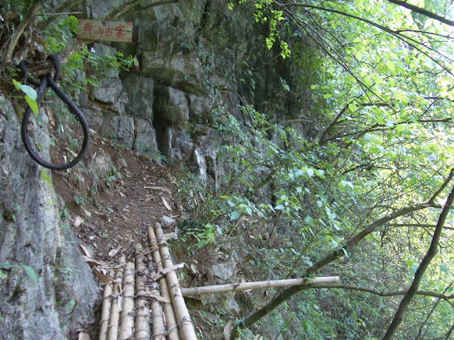 首先前往參觀他的家和寄存單車。因為他的家叫毛毛家,所以本文稱他為毛毛家導遊。登山的路名為黃山古寨,修建於清代,而毛毛家的後院就是登山入口。他帶著一根樹枝,走在前方,一邊帶領我登山的路,一邊講解黃山古寨的歷史和故事。山路有點兒崎嶇,但他照顧周到,不時回頭看我體能情況,調節速度。遇上難行的山路時,便找來大石當石級。沿途還清除路面的枯葉,常常叫我注意腳下的碎石和頭上橫生的樹枝。