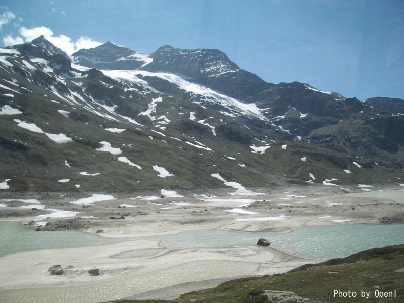 列車行經高山上,看到山上積雪及溶雪造成小湖.
